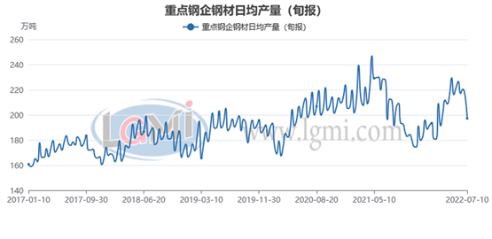 據(jù)中國鋼鐵工業(yè)協(xié)會統(tǒng)計數(shù)據(jù)顯示,2022年7月上旬重點鋼企生鐵日均產(chǎn)量191.55萬噸,旬環(huán)比下降2.09%,同比上升2.98%;7月上旬重點鋼企粗鋼日均產(chǎn)量207.48萬噸,旬環(huán)比下降1.98%,同比下降2.94%;7月上旬重點鋼企鋼材日均產(chǎn)量197.31萬噸,旬環(huán)比下降9.36%,同比上升0.52%。