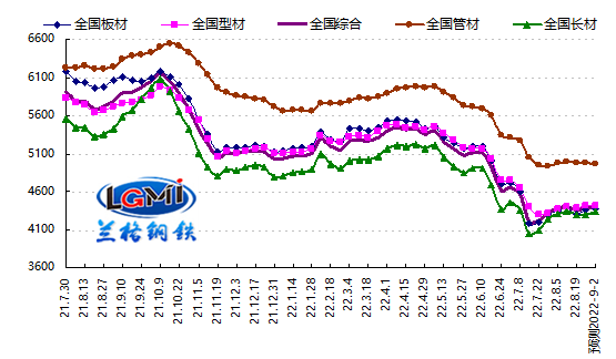 2022年第35周(2022.8.22-8.26)蘭格鋼鐵全國(guó)絕對(duì)價(jià)格指數(shù)為4386元,較上周上升0.9%,較去年同期下降23.5%。其中,蘭格鋼鐵長(zhǎng)材絕對(duì)價(jià)格指數(shù)為4300元,較上周上升0.4%,較去年同期下降19.9%;蘭格鋼鐵型材絕對(duì)價(jià)格指數(shù)為4405元,較上周上升0.4%,較去年同期下降22.6%;蘭格鋼鐵板材絕對(duì)價(jià)格指數(shù)為4357元,較上周上升1.7%,較去年同期下降27.4%;蘭格鋼鐵管材絕對(duì)價(jià)格指數(shù)為4982元,較上周下降0.1%,較去年同期下降19.9%。